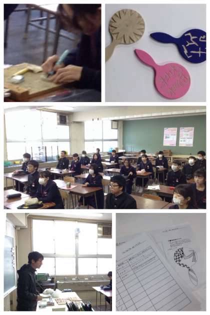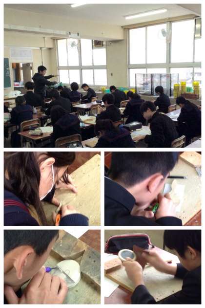 2年生の生徒たちが、とても明るくなった美術室で、一生懸命に手鏡の製作に取り組んでいます。完成が近付いてきた生徒、デザインにこだわっている生徒。一人ひとりが世界で1つしかない作品作りに集中しています。