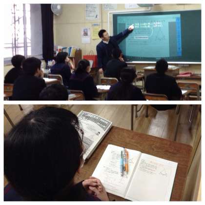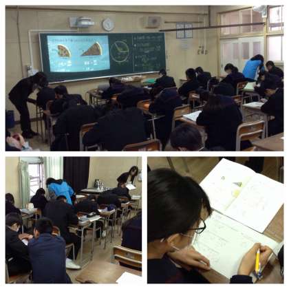 1・2年生が3学期に学習する数学の単元の1つは図形。この日、1年生では、「ピザ」を題材におうぎ形の面積と孤の長さの学習。2年生では、三角形を題材に証明の学習。いずれも、これまでに学習した事柄を整理して活用していくことが求められます。「プログラム的思考」の習得にもつながる学習です。