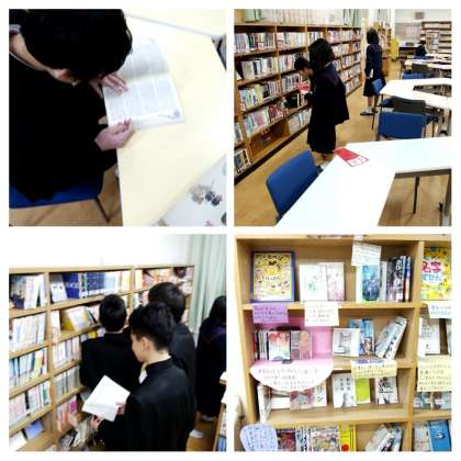 昼休みの図書館は、本を借りに来る生徒や読書する生徒、授業の小テストの勉強をする生徒たちが利用しています。静かに過ごす貴重な時間です。