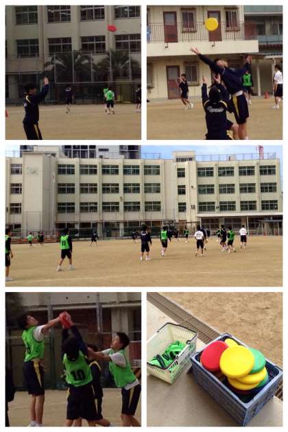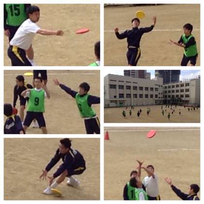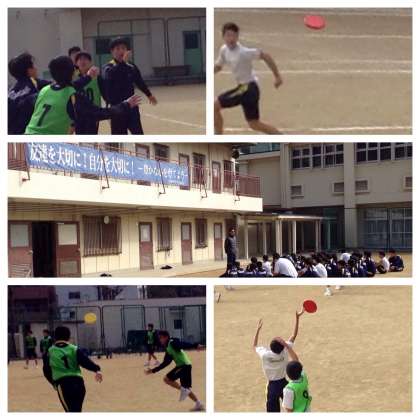 私立高校の受験も終わりひと段落の3年生。指先をケガしないように柔らかい素材のディスクを使い、運動場で元気いっぱいに楽しく授業に取り組んでいました。