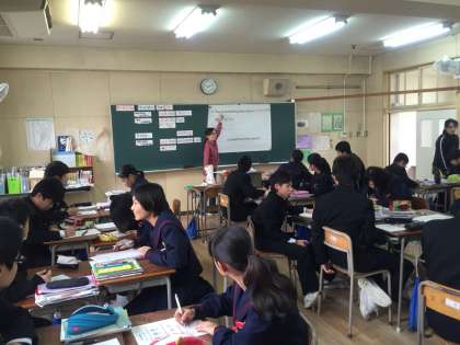 3年生「英語」の授業です。関係代名詞の学習を進める中で、ペア学習を行っています。