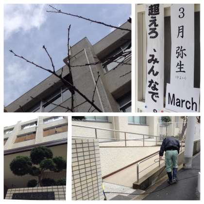 学校周辺の溝を高水圧ポンプを使って洗浄しています。卒業式まで10日。こんな時だからこそ、卒業式に向けて、心を込めて教職員で整美を進めています。