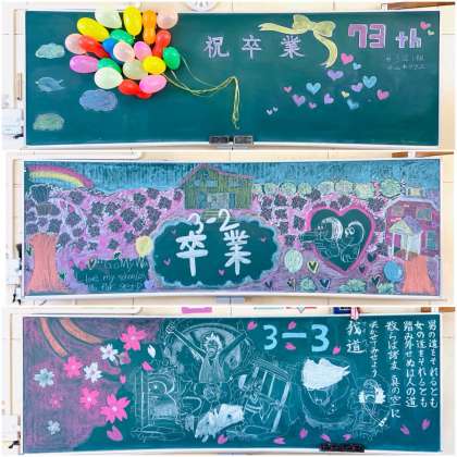 3年生の教室の黒板に、有志の皆さんが、素敵なデコレーションを施してくれました。1年間使ってきた教室。突然の臨時休業に戸惑いもありましたが、天候に恵まれ、卒業証書をすべての3年生に手渡すことができました。ありがとうございました。