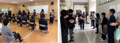 今年度末をもって異動される校長先生と、転退職される教職員の先生の離任式を行いました。PTA役員・実行委員、元気アップコーディネーターと本校教職員が多目的室に集まりました。(窓を開放し、共用物などを消毒しています。)