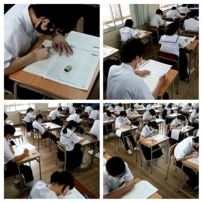 本日午後、漢字能力検定を実施しました。3年生は、受検級ごとの教室に分かれ、検定問題を解きました。今年度は長期の臨時休業のため、当初予定していた段取りで事前学習ができないことがありましたが、生徒たちはライセンス取得に向けてよく取り組みました。