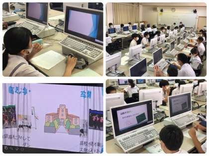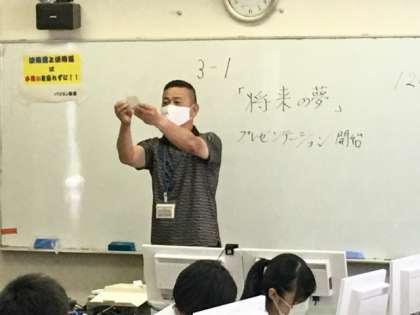 3年1組の技術です。パワーポイントを使って「将来の夢」をプレゼンしています。クラス生徒全員の前で夢を語る生徒はキラキラ輝いていました。発表の間は発表者も聞くも者も心地よい緊張感があります。