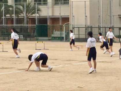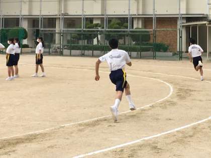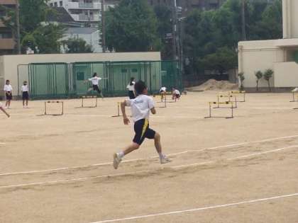 今日は、曇空のためか少し凌ぎやすいです。グラウンドでは、3年生の体育の授業です。男子は短距離走、女子はハードル走に取り組んでいます。さすが3年生力強い走りです。