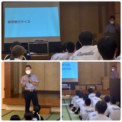 学年主任の清家先生から「修学旅行クイズをします。」と発表しました。明日からの修学旅行がさらに深く楽しむための企画です。解答用紙を配り15問の問題に取り組みました。さすが3年生、真剣に取り組みました。