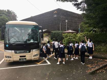 修学旅行2日目の工程が始まりました。1組のバスは高知城公園に到着しました。