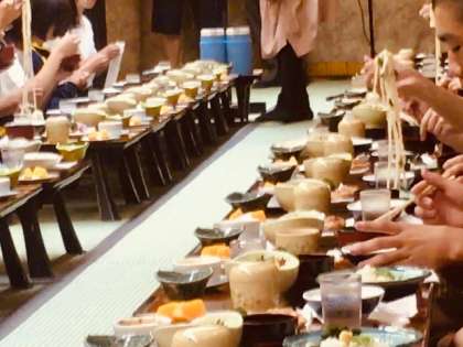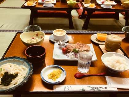 修学旅行、2日目の夕食の様子です。讃岐うどんが食欲をそそります。