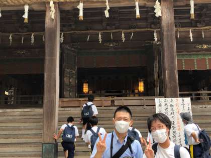 昨日のクイズ大会、優勝者の景品である学年主任とのツーショット写真を本宮前で撮りました。