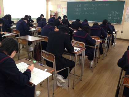 本日、3年生は第4回実力テスト「英語・国語・社会」をおこないました。普段は朝の読書をしている、8時25分から40分までの時間、今朝はみんな黙々とテスト勉強をしていました。明日は実力テスト2日目、理科と数学です。