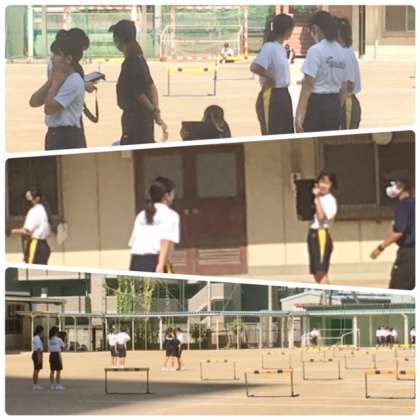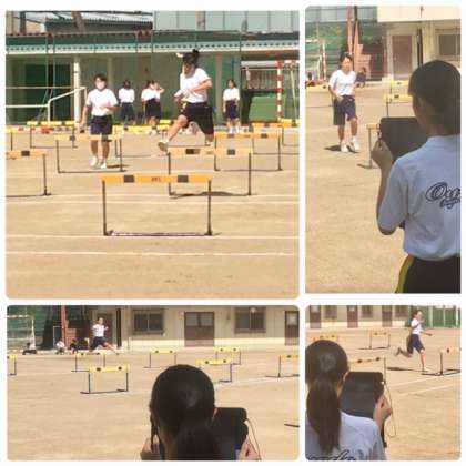 グラウンドでは、2年2・3組女子が体育授業(ハードル走)を学習しています。タブレットを使って自分自身の演技を確認して学習を進めています。