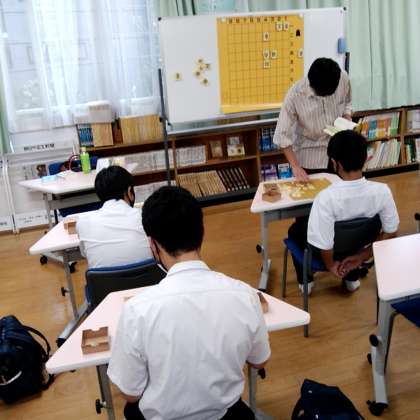 四段のプロ棋士の先生に来ていただいて、「放課後将棋講座」をしました。参加している生徒は少数ですが、直接ご指導いただいて、放課後に将棋の楽しさを十分に味わっています。