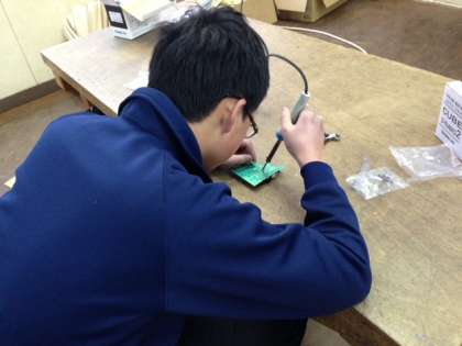 2年生の技術の授業では、電気エネルギーの利用について学習しています。写真は、電子回路の基盤に抵抗器などの部品をはんだ付けしているようすです。丁寧に作業を進めていました。災害などの緊急時にも、手回しで発電して使用できるラジオが完成する予定です。