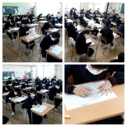 実力テストを行いました。今回のテストは、中学卒業後の進路選択をする上で、特に大切になってくるものです。先日の進路懇談を受けて、具体的な目標を立てて取組んできました。どの生徒も真剣にテスト問題に向き合っていました。