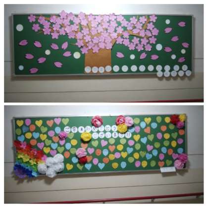 3年生が利用する中央階段に、桜が咲いています。(1.2年生より卒業生へのメッセージを掲示しています。)
