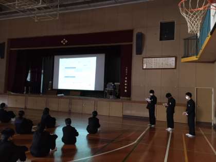 2年生保健委員が、「睡眠日記」と「年間活動」のまとめを学年集会で報告会を行いました。