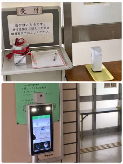 玄関に設置しています受付用紙に記入いただき、アルコール自動噴霧器で手指の消毒ならびに、サーモグラフィーカメラで検温してください。発熱等症状のある方のご入校はご遠慮くださいますよう、ご協力よろしくお願いします。