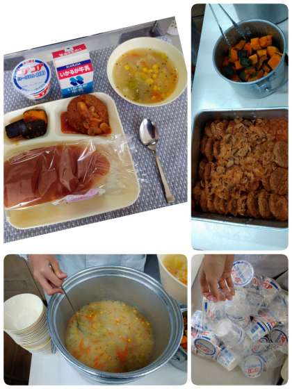 4月16日(金)、今日の給食は、煮こみハンバーグ・コーンスープ・焼きかぼちゃ・ヨーグルト・こっぺパン・いちごジャム・牛乳です。