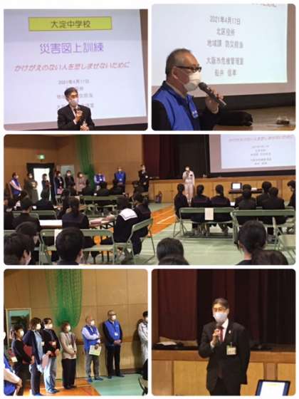 防災訓練には、北区役所前田区長様をはじめ、北区役所の皆様、大阪市危機管理室の皆様、北消防署の皆様、学校元気アップ地域本部の皆様のお力添えで開催しています。