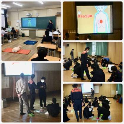 2年生は危機管理室、北消防署、地域防災リーダーの皆様に、クラス毎で心肺蘇生法を学びました。