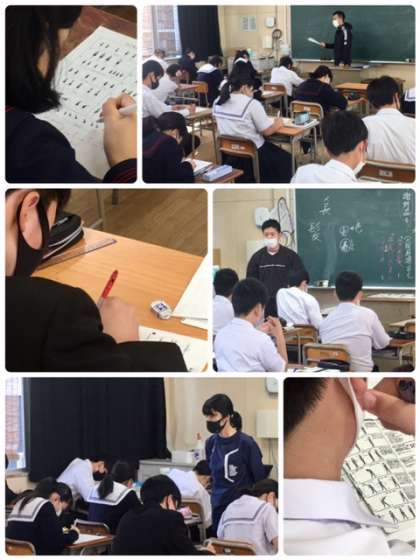 写真は1年生の学習風景、2年生の家庭科課題果の掲示、2年生の学習風景です。