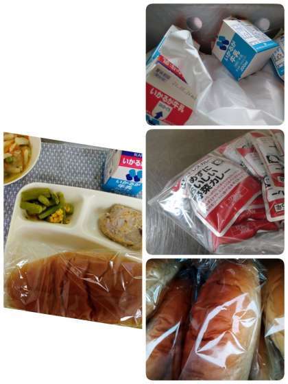 3年生の給食は、ヒートレスカレー・黒糖パン・牛乳です。(写真右側)