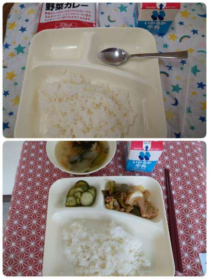 5月21日(金)の1・2年生の給食は、ホイコウロー・中華スープ・きゅうりのピリ辛あえ・ご飯・牛乳です。(写真下段)