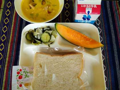 6月8日(火)の給食は、かぼちゃのクリームシチュー・ミックス海そうのサラダ・クインシーメロン・食パン・りんごジャム・牛乳です。