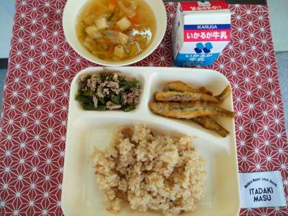 6月9日(水)の給食は、いわしのてんぷら・五目汁・豚肉とさんどまめのいためもの・かやくご飯・牛乳です。