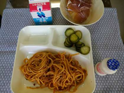 6月10日(木)の給食は、スパゲッティミートソース・きゅうりのピクルス・発酵乳・1/2黒糖パン・牛乳です。