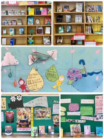 図書館前のディスプレイが新しくなっていました。新刊書がたくさん入っています。「映画になった小説たち」コーナーもあります。