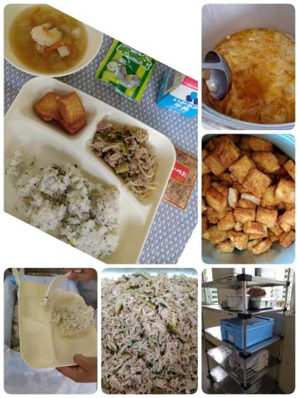 7月5日(月)の給食は、ゴーヤチャンプルー・すまし汁・あつあげのしょうがじょうゆかけ・まっ茶大豆・菜飯・牛乳です。