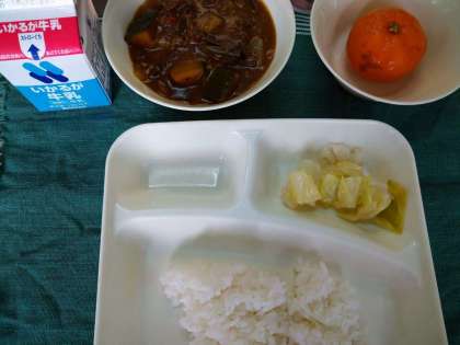7月12日(月)の給食は、夏野菜のカレーライス・キャベツのサラダ・冷凍みかん・ご飯・牛乳です。