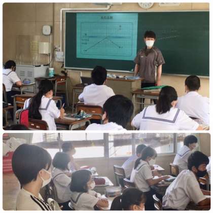 1年2組の学習の様子です。大久保先生の話に生徒は引き込まれています。松瀬先生も教室内習熟度別学習で子どもたちに関わっています。