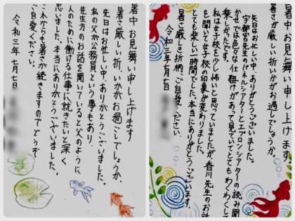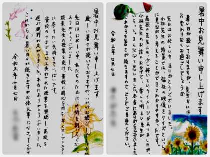 3年生は、6月30日に実施した「キャリア学習」高校出前授業でお世話になった講師の先生方にお礼の手紙を書きました。ハガキの文面からは感謝の気持ちと高校進学への期待の高まりを感じました。各高等学校の先生方、ありがとうございました。夏休みのオープンスクールや入学説明会でお会いするのを楽しみにしています。