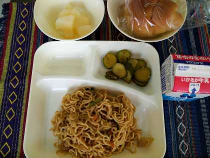 8月31日(火)の給食は、オイスターソース焼きそば・きゅうりの中華あえ・和なし(カット缶)・1/2黒糖パン・牛乳です。