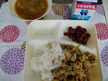 9月2日(木)の給食は、他人丼・とうがんのみそ汁・金時豆の煮もの・ご飯・牛乳です。