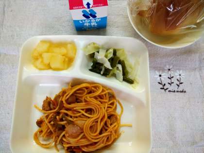 9月3日(金)の給食は、イタリアンスパゲッティ・グリーンアスパラガスとキャベツのサラダ・洋なし(カット缶)・1/2黒糖パン・牛乳です。