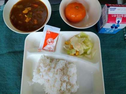 9月6日(月)の給食は、チキンカレーライス[米粉]・キャベツとコーンのサラダ[ノンエッグドレッシング]・みかん(冷凍)・ご飯・牛乳です。