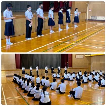 今日は、3年生が体育館で学年集会をしています。先日、行われた各委員会から報告がありました。