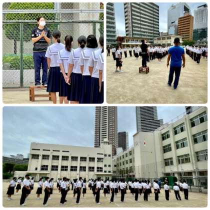 今朝は、1年生は運動場で学年集会を行っていました。今朝は米原先生から体育大会への心構えについてお話がありました。