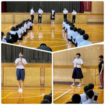 今年の生徒議会では、応援の方法について積極的な意見がたくさん出されたそうです。今日の放課後も臨時の生徒議会を開いて協議します。制限の多い中ですが、みんなで知恵を出し合い、創意工夫を凝らして思い出深い体育大会にしましょう。