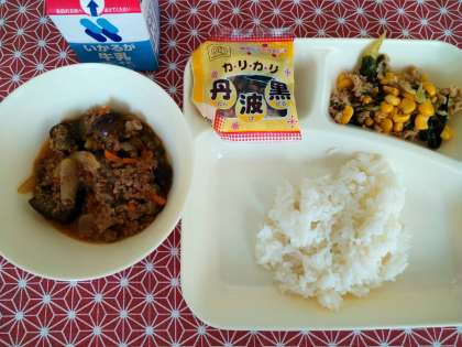 9月9日(木)の給食は、マーボーなす・ツナとチンゲンサイのいためもの・いり黒豆・ご飯・牛乳です。
