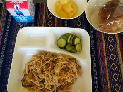 9月10日(金)の給食は、焼きそば・きゅうりのしょうがづけ・洋なし(カット缶)・1/2黒糖パン・牛乳です。