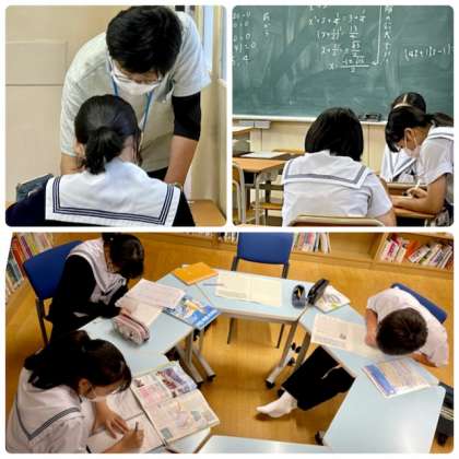 放課後の教室では、先生に学習を教えていただいたり、図書館で自習して過ごしている生徒がいます。元気アップで図書館ボランティアしている方にうかがうと、利用している生徒から「塾の自習室より落ち着いて勉強できます。」と感想を聞かせてくださいました。