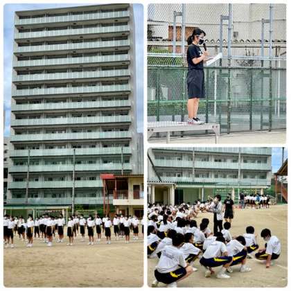 6時間目、1年生は体育大会の練習です。心配されていた雨もあがり運動場で練習できました。