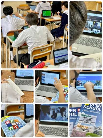 6時間目の後半、3年生は進路について調べ学習に取り組んでいます。高等学校のホームページや冊子を参考に、将来の夢や希望を叶えられる学校、自身の特性や良さを伸ばせる学校を調べています。夏休み中に行われたオープンスクールや高校説明会も参考に主体的に保護者の方々と話し合ってください。