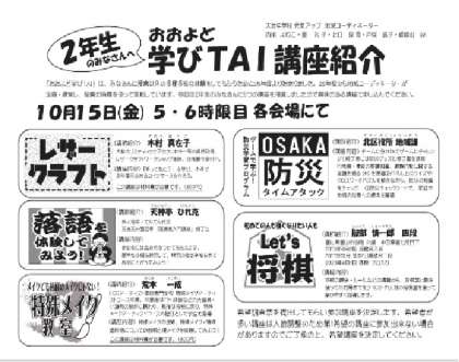 当日は「レザークラフト」「落語を体験してみよう」「特殊メイク教室」「OSAKA防災アタック」「Let's 将棋」の5つの口座が開かれます。